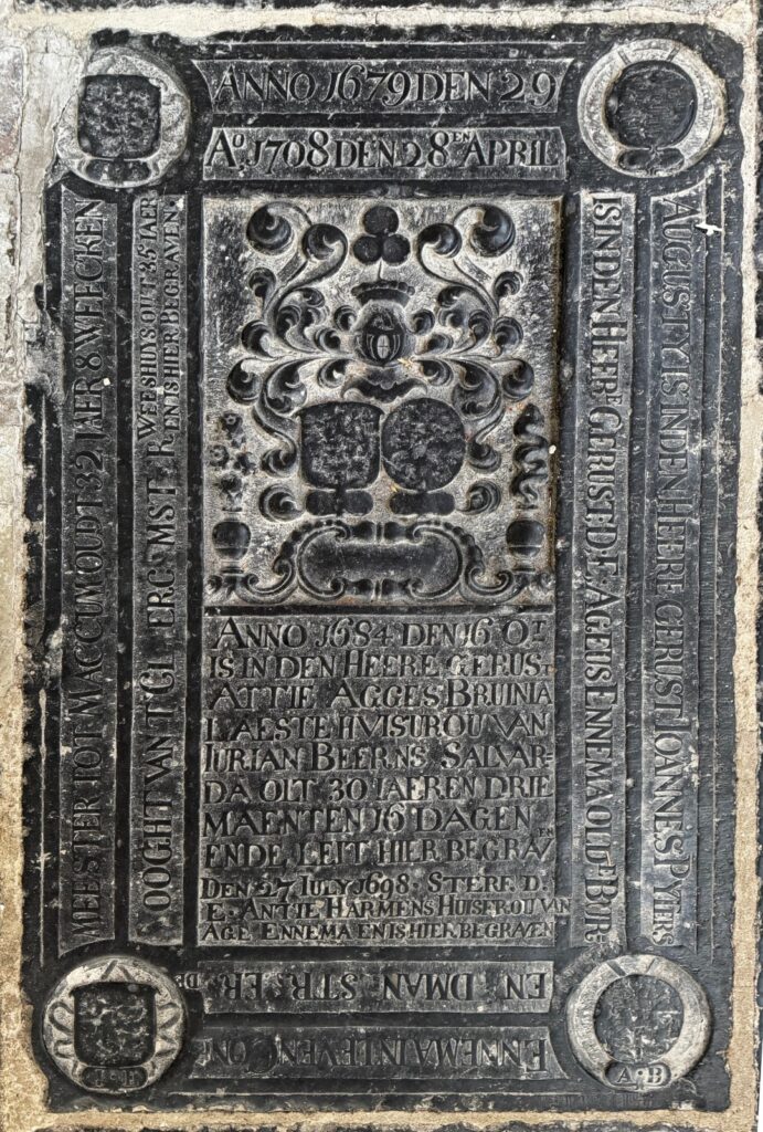 Zerk 167 Het randschrift is in twee regels op de zerk aangebracht. Randschrift buitenste regel is: Anno 1679 den 29 Augusty is in den Heere gerust Iohannes Pyters Ennema in leven Conf. meester tot Maccum oudt 32 jaer 8 weecken binnenste rand: Ao 1708 den 28 en April is in den Heere Gerust D.E. Ageus … Zerk 167