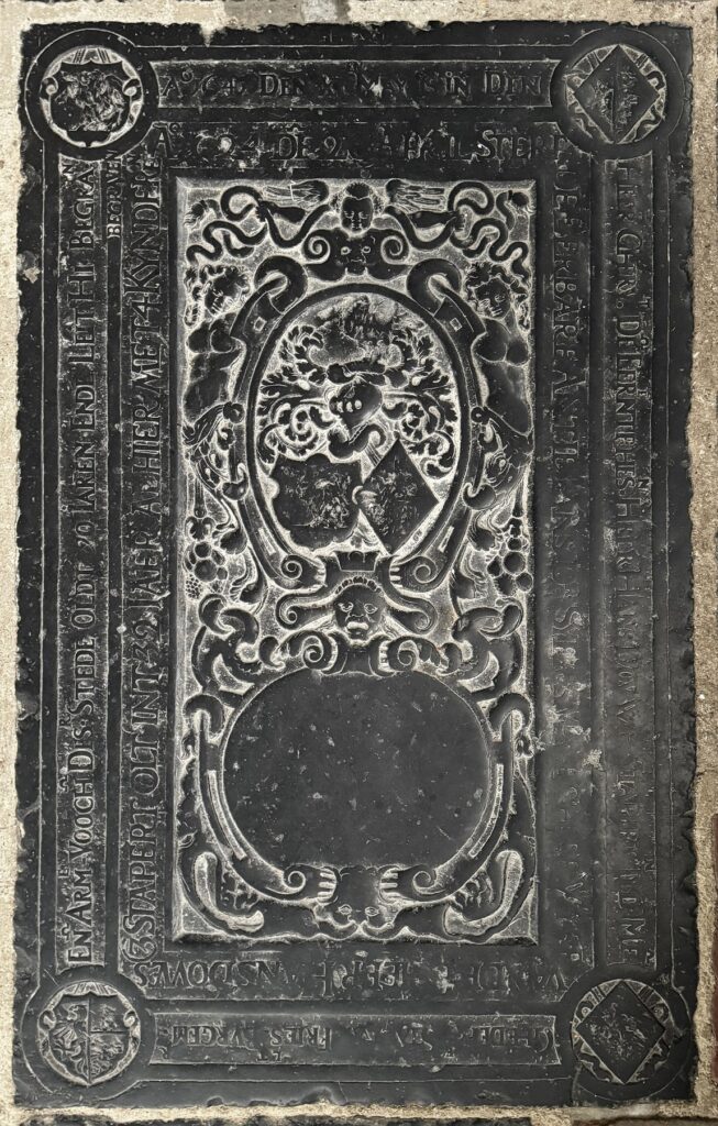 Tekst buitenste randschrift is: Ao 1647 Den XIen May is in Den Heer Gherust De’ Eerentphes’n Heer Hans Dovwe Stapert in Tyd Me’ ‘de Staat va’ Frieslt. Bvrgem. En’ Arme Voocht Desr Stede Oldt 70 Iaren Ende Leit Hi’ Begrav’n binnenste randschrift is: Ao 1624 de’ 20 April Sterf de Eerbare Antie Ians dor syersma … Zerk 168
