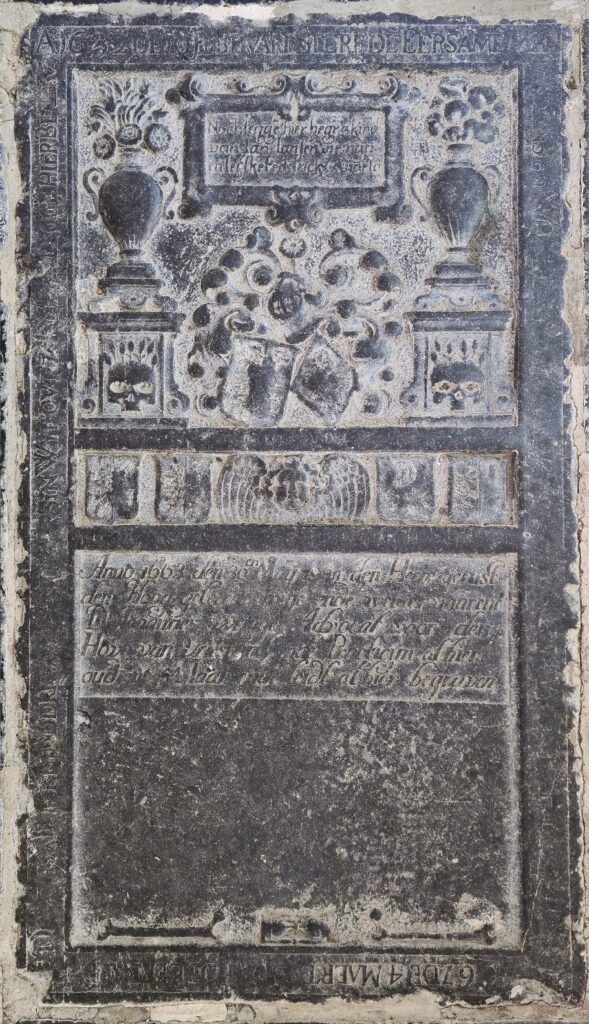 Zerk 181 Deze zerk is op het middenvlak voorzien van eenvoudig, doch fraai beeldhouwwerk. De tekst in het randschrift is nogal beschadigd waardoor de namen moeilijk leesbaar zijn. Ook de tekst op het middenvlak is door slijtage moeilijk te ontcijferen. Het randschrift is: Ao 1632 de’ 18 Februari Sterf de’ Eersame man jan jansse wringer … Zerk 181