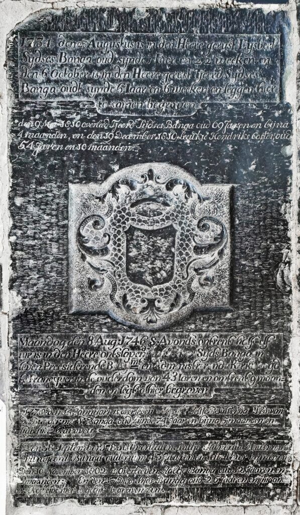 Zerk 182 Een zerk welke betrekking heeft op een familie Banga. Het familiewapen is weggekapt. De tekst in de rechthoek boven het beeldhouwwerk is: 1734 den 23 Augustus is in den Heere gerust Lijsbert Sijdses Banga oud synde 1 Iaer en 22 weeken en den 6 October is in den Heere gerust Tjeerd Sijdses Banga … Zerk 182