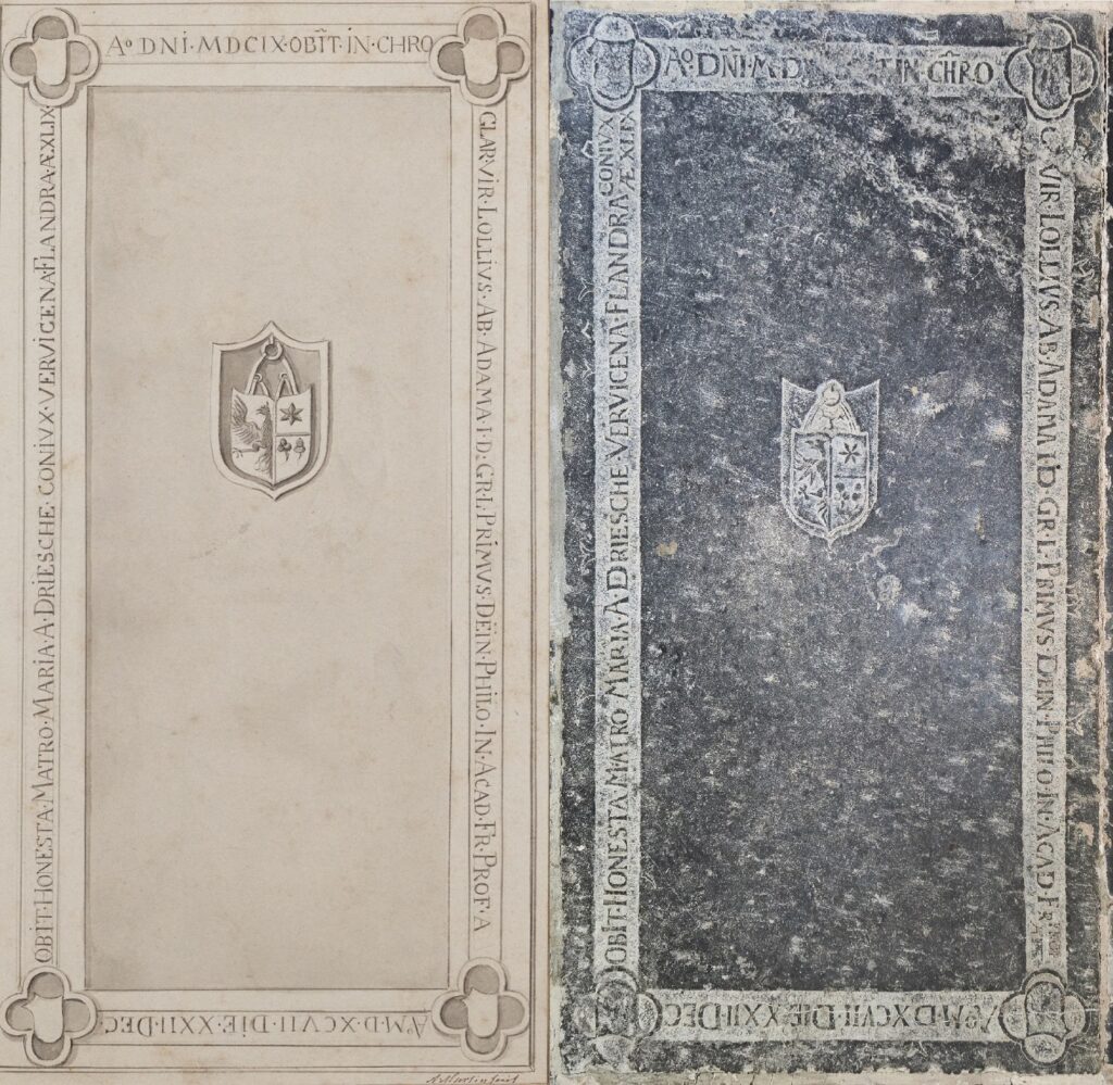 Zerk 185 Deze zerk is alleen van een randschrift voorzien. Op het middenvlak is een wapenschild aangebracht. De onderstreepte woorden staan in kleine letters boven elkaar. Het randschrift is: Ao dni.MDCIX obit in Chro. C.vir Lollius Ab Adama I.D. GR.L. Primvs Dein. Philo. In Acad. Fr prof aet. ## Ao MDXCVII Die XXII Dec. Obit … Zerk 185