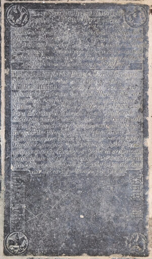 Zerk 188 Opnieuw een zerk betreffende de familie Huber. In twee blokken tekst wordt het trieste verhaal van het overlijden van een dochter en zoon van Ulricus Huber verteld. De titels van Huber die in de tweede regel genoemd werden, zijn in de Franse overheersing weggekapt. ….. Suffrida Huber oldste dochter van den H. Ulricus … Zerk 188