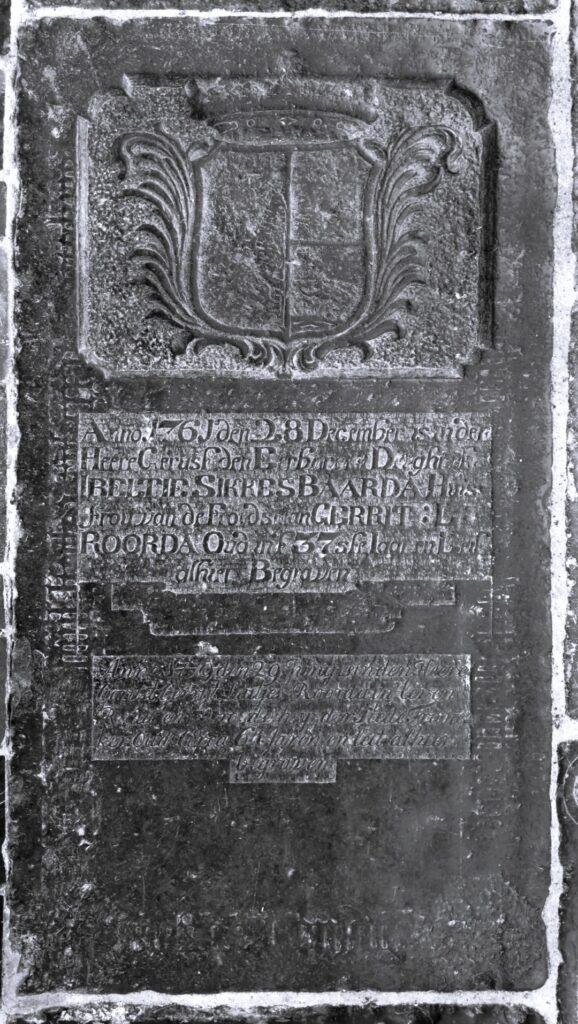 Zerk 191 Deze steen is eerder in gebruik geweest, maar het gotisch randschrift is niet meer te lezen. Anno 1761 den 28 December is in den Heere Gerust den Eerbaren en deughrijke ibeltie Sikkes Baarda huis frou van de Froedsman Gerrit Gerrit L: Roorda Oud int 37ste Iaar en leit alhier Begraven. Anno 1779 den Zerk 191