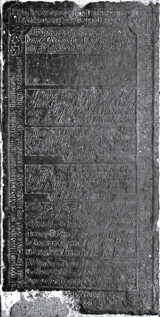 Zerk 198 Het randschrift van deze zerk bestaat uit twee regels geheel rondom. Een deel is weg en vervangen door cement. Randschrift buitenste regel is: Den 12 Iunius 1748 is in den Heere gerust de Eerbare Antie Beerns Salverda Huisvrouw van Tiepke Hylkes Abbema ovd Ontvanger der Boelgoederen deser stede ovd 81 Iaaren en 5 … Zerk 198