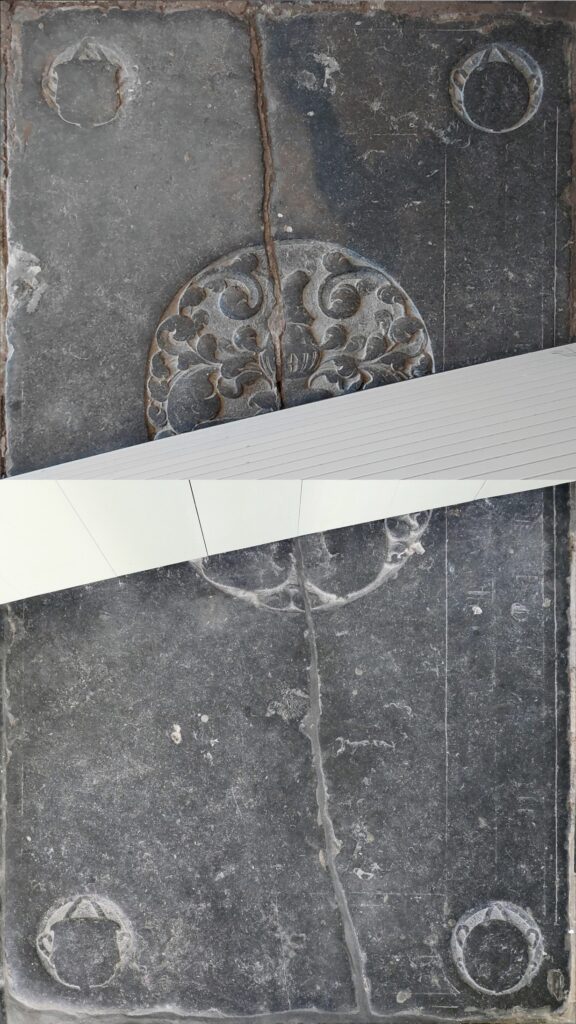 Zerk 20 Leesbare tekst is op deze grote zerk niet meer aanwezig. Wel is nog te zien dat er een dubbel randschrift op heeft gestaan. De wapenschilden op de hoeken zijn van een afwijkende vorm. Dat van de vrouw is rond in plaats van het gebruikelijke ruitvormige. De schilden hangen aan een lint. Van de … Zerk 20