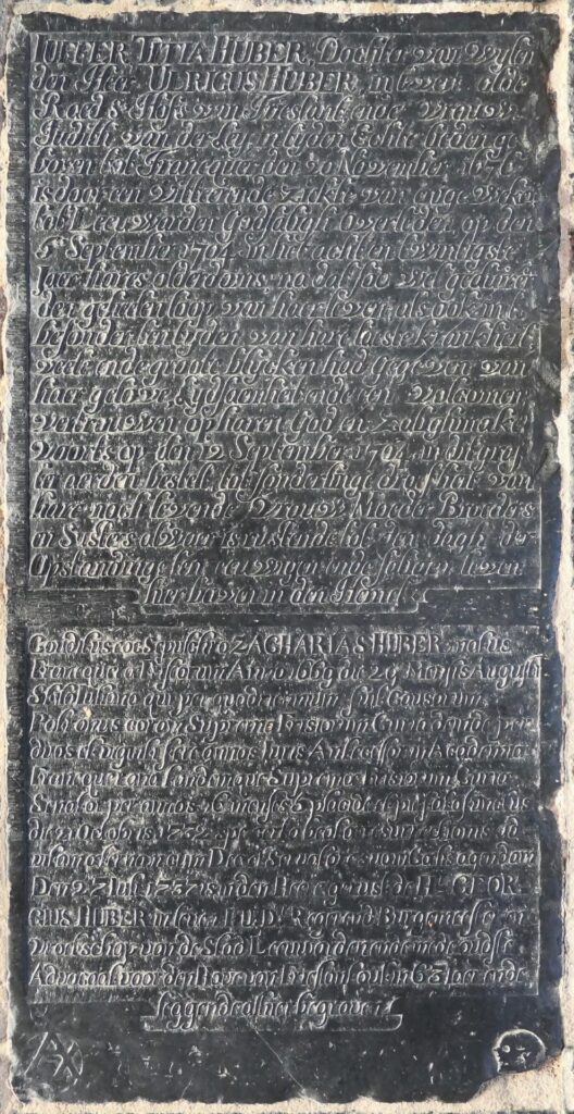 Zerk 200 Deze zerk is de tweede betreffende de familie Huber. De tekst beslaat bijna het gehele middenvlak. Juffer Titia Huber dochter van wylen den heer Ulricus Huber in leven olde raed s’hofs van Frieslant ende vrou Iudith van der Ley, in tyden echte leiden, geboren tot Franequer den 20 november 1676 is door een … Zerk 200