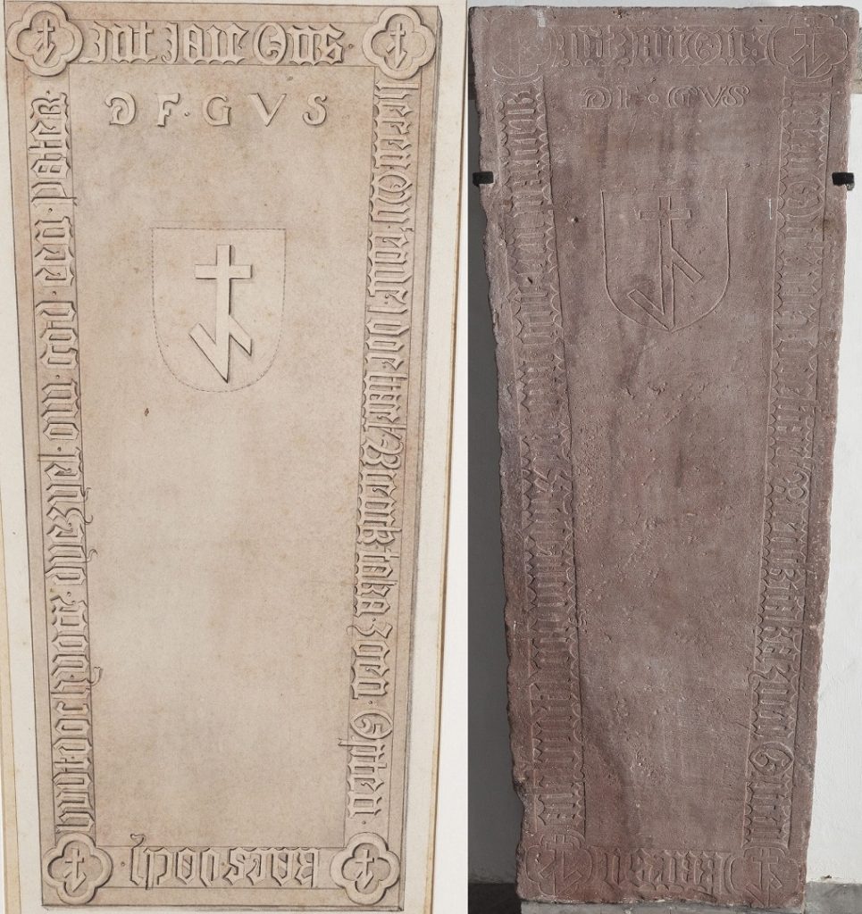 Zerk 215 Deze rode Bremer is nog geheel compleet wat tekst betreft. Tekst randschrift is: Int iaer ons Heren M Vc ende I doe starf Rienck Takezoen opten karsdach bydt doch voir dye zyel om God een paeternoster Op het middenvlak een wapenschild met een huismerk dat ook in vierpassen op de hoeken staat: een … Zerk 215