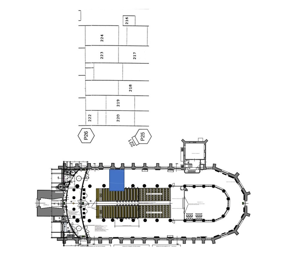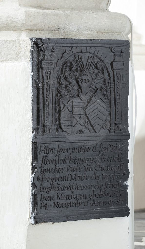 Zerk 221 Opschrift aan den pilaar onder den preekstoel* Hier foijr onder desen witte(n) steen leit begraven de(n) edele(n) Joncker PIET(E)R VA(N) CHALLANSI, sergeant Maior des Vriescen Regimente en(de) is voor die scha(n)se van Mackum ghebleve(n) de(n) 14 Novembris Anno 1580. Met de wapens van Challansi en Egmond van Merestein, onder eenig lofwerk. Pieter van … Zerk 221