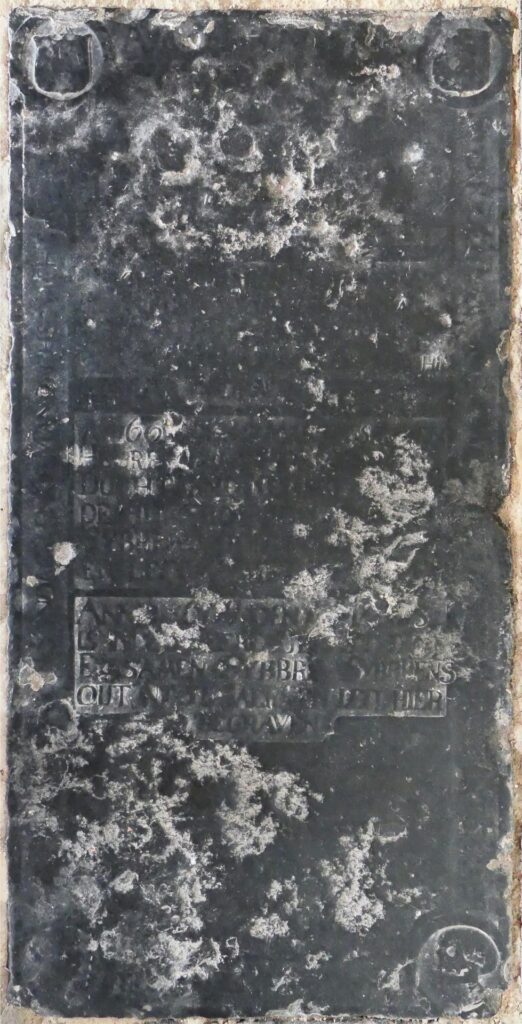 Zerk 226 Deel tekst randschrift is: anno ….. sterf den eersame … int 55 jaer. anno ……. Sondach ende mandachs Nach Tekst middenvlak is: Ao 1665 den 2 Maerti is in den Heere Gerust den eersame ende Dugtsame Kenske………. de` huisfrou van Sybren Sybrens out int .. iar en leit alhier begraven Anno 1668 den … Zerk 226
