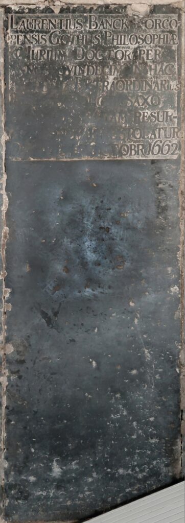 Zerk 23 De tekst van deze zerk is aan de linkerkant wat moeilijk leesbaar, maar wel te ontcijferen. Tekst zerk is: Lavrentius Banck Norco- pensis Gothus Philosophiae & Iurium Doctor per Annos ovindecim in HAC Academiae Extraordinarius Professor HOC saxo conditus Beatam Resur- rectionem Praestolatur Obiitus 13 October 1662 Laurentius Banck is geboren in 1617 … Zerk 23