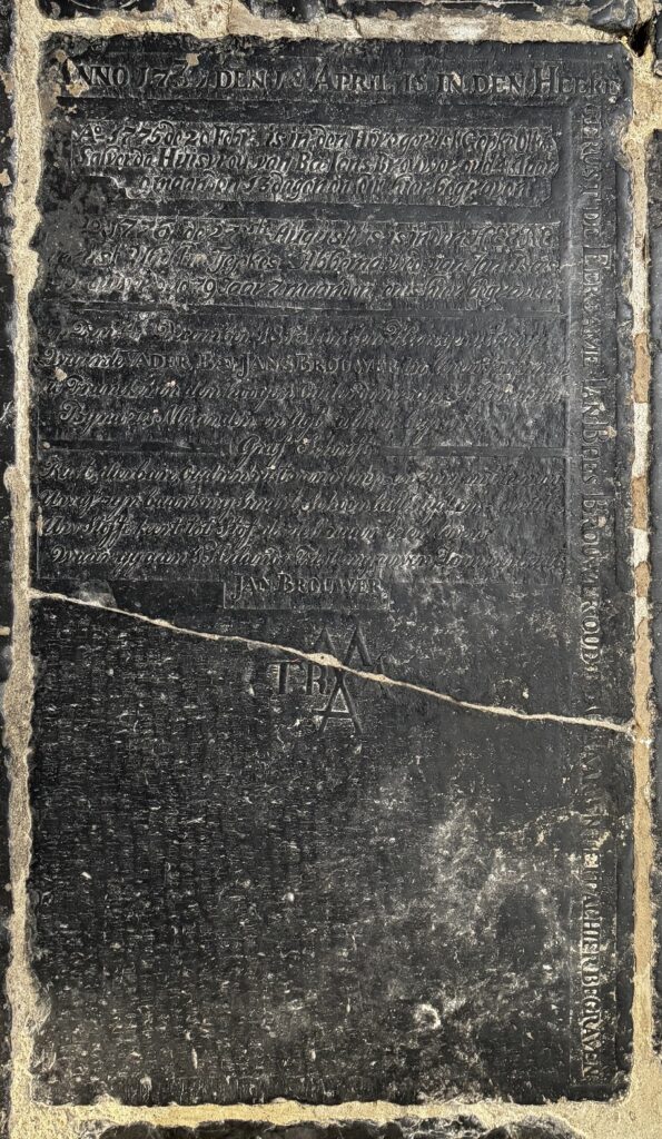 Zerk 230 Een zerk, waarvan de tekst niet gaaf is. Als een deel van de tekst is verwijderd, dan is dit vakkundig gebeurd, want van dat karwei zijn geen sporen achter gebleven. Tekst deel randschrift is: Anno 1731 den 18 April is in den Heere gerust de eersame Jan Bees Brouwer oudt 56 Jaar en … Zerk 230
