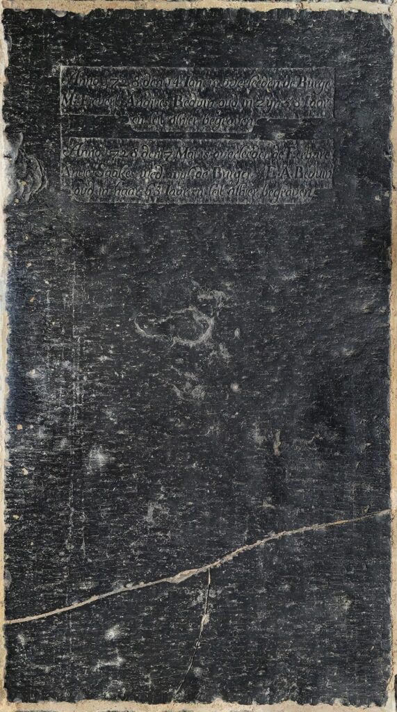 Zerk 241 Deze zerk is eerst schoon gekapt. Tekst op middenvlak is: Anno 1728 den 14 Ian: is overleden de Burge M: Eevert Andries Beduim oud in zijn 58 Iaar en leit alhier begraven Anno 1728 den 7 Mai is overleden de Eerbare Antie Saakes wed. wijf. de Burgerm. E.A. Beduim oud in haar 63 … Zerk 241