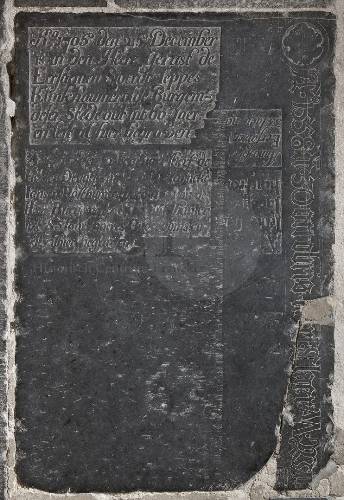 Zerk 255 Deze zerk is zowel in de 16de, 17de als de 18de eeuw van tekst voorzien. Het randschrift is het oudste. Delen van tekst op het middenvlak geven het jaar 1662 aan en zijn later weer door andere tekst overschreven. Deel van het randschrift is: Ao 1558 de` 30 octobris starf in iaer M.D….. … Zerk 255