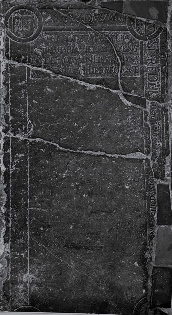 Zerk 272 De tekst van de zerk is eveneens erg beschadigd. Wat er van leesbaar is, volgt hier, te beginnen met het randschrift: Ao 1503 de’ 27 maii ……………….. sterf De’ Ersame man Cornelisz in ….. Op het middenvlak staat: Ao 1617 den 27 Mai sterf de’ eerbare Hielke Rijens dor de Hopman Lieuwe Jans … Zerk 272