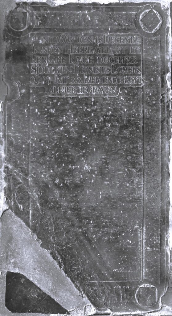 Zerk 274 Deze zerk is ontdaan van de oorspronkelijke tekst. Op het middenvlak staat: Anno 1665 den 15 December is in den Heere gerust de Eerbare jonge dochter Sjouckjen Dionicius Lomars oudt int 22 Jaer ende leyt alhier begraven. Sjoukje Dionisius Lomars, geboren rond 1643, overleden 15-02-1665, 22 jaar oud. Op 11 april 1663 doet … Zerk 274