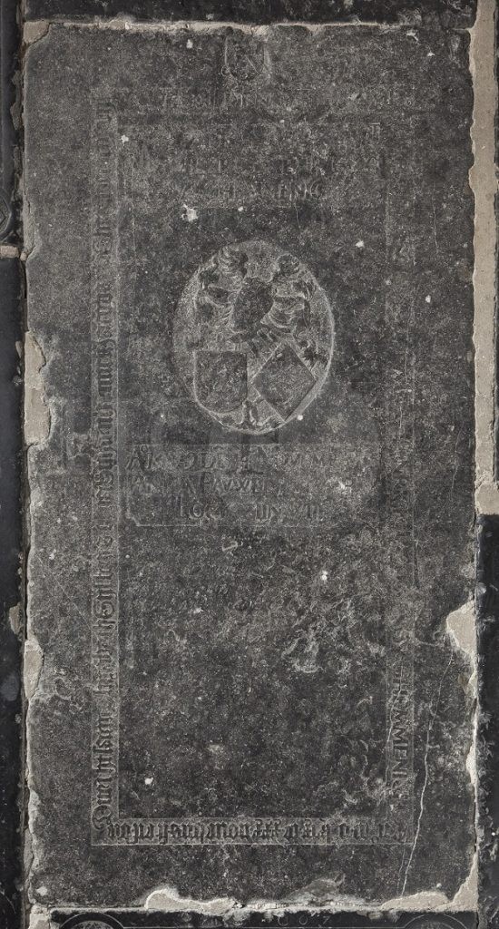 Zerk 28 De tekst van deze zerk is nogal beschadigd. Maar met gegevens uit het oudste grafregister is de tekst redelijk compleet te maken. Het randschrift is: Ao MVC L XXII den XX September sterf den Eersamen man Henrick Jacobs van Ghemmenich Ao MVC L XIX de’ XXII Novembris sterf die duechtsame Huijsfrov Lijsabeth Gijsbertsdr … Zerk 28