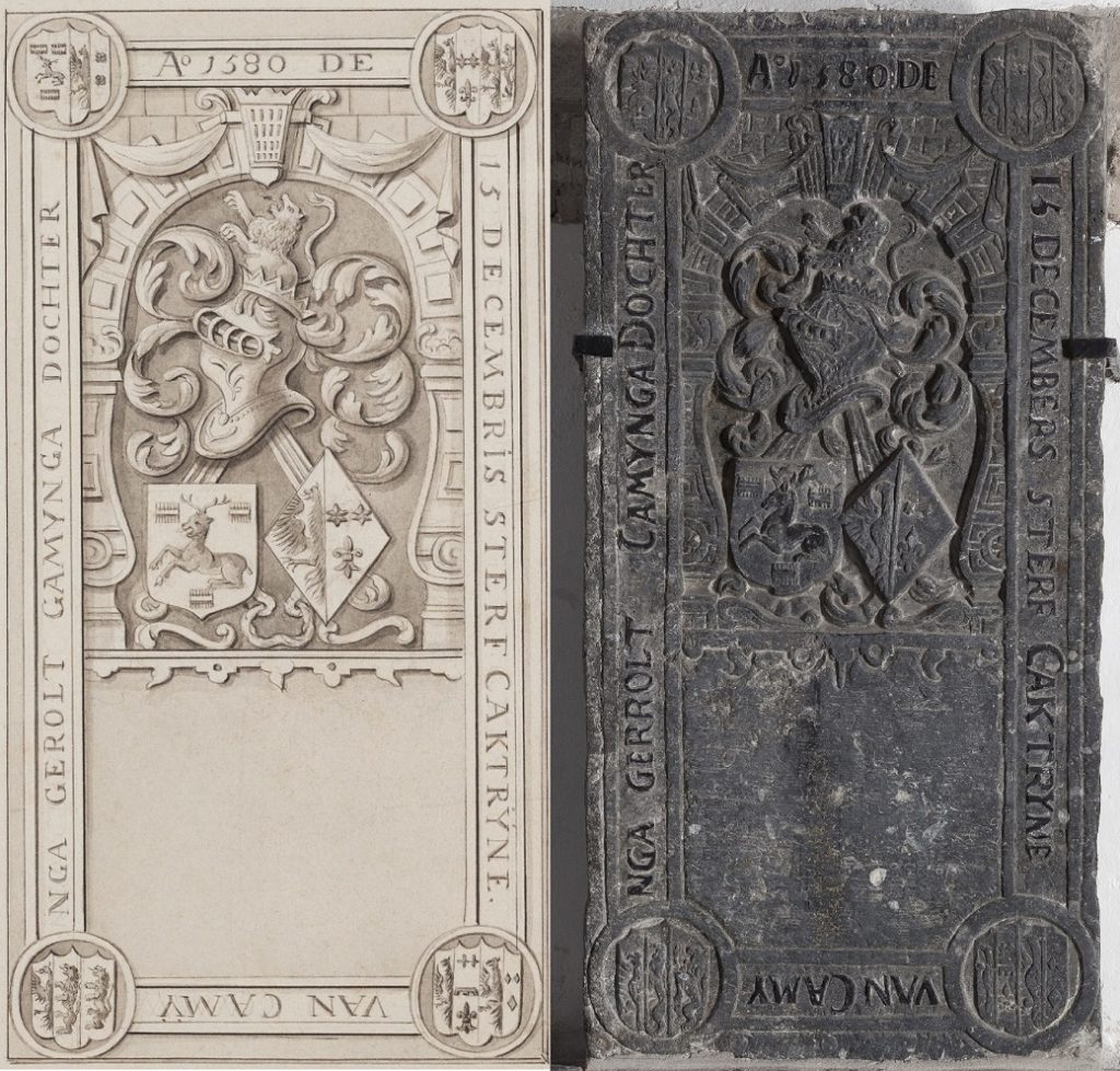 Zerk 30 De foto van de zerk is uit: Collectie RCE. Maker: Chris Booms (11-03-2013) De tekening PTA104-026_01 is uit: Collectie Fries Museum, Leeuwarden, Maker: Albert Martin. Het randschrift van het kleine zerkje is: A(nn)o 1580, de(n) 15 Decembris sterf CATTRIJNE VAN CAM(M)IJNGA, GERROLT CAM(M)IJNGA dochter. In het midden de wapens Cammingha en Ockinga met … Zerk 30