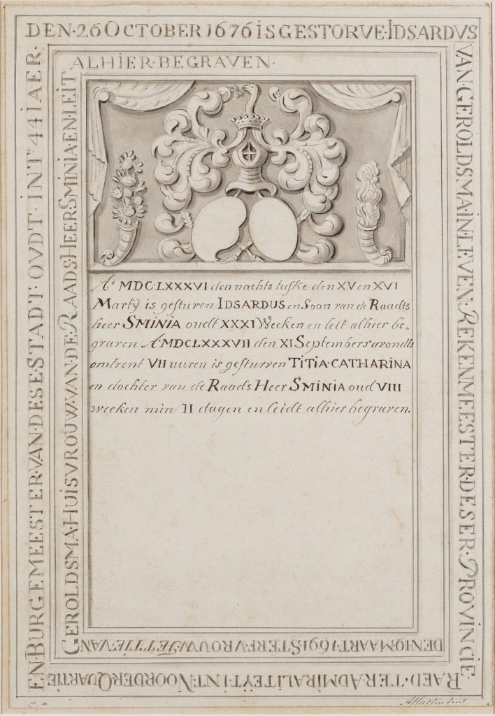 Zerk 309 De zerk heeft twee randschriften. Tekst randschrift buitenkant is: Den 26 October 1676 is gestorven Idsardus van Geroldsma in leven Rekenmeester deser Provintie Raed ter Admiraliteyt int Noorder quartier en Burgemeester van deser Stadt oudt int 44e Iaer Tekst binnenrand is: Den 9 Marti 1691 Stierf Vrou Tettie van Geroldsma Huysvrouw van de … Zerk 309