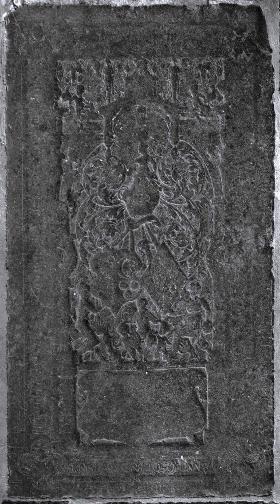 Zerk 310 De zerk is erg afgesleten. Een deel van het randschrift is nog leesbaar. Anno 1650 den .. ……. is in den Heere Gerust ……. Heel vaag zijn nog sporen van de oorspronkelijke tekst te zien die betrekking heeft op de familie Hottinga. Berber ? Het fraaie beeldhouwwerk is nog wel redelijk te zien. … Zerk 310