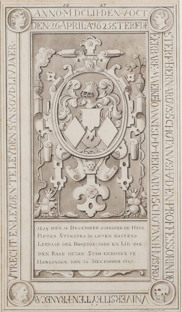 Zerk 320 Deze zerk heeft betrekking heeft op één van de leden van het bekende geslacht Schotanus, namelijk Bernardus en zijn vrouw. Randschrift buitenkant is: Anno MDCLII den V oct. starf Bernardus Schotanus J U D en professor in d’ universiteyten va’ Franecar Utrecht en Leyden te Leyden sijns oudles LIV iaer Randschrift binnenkant is: … Zerk 320