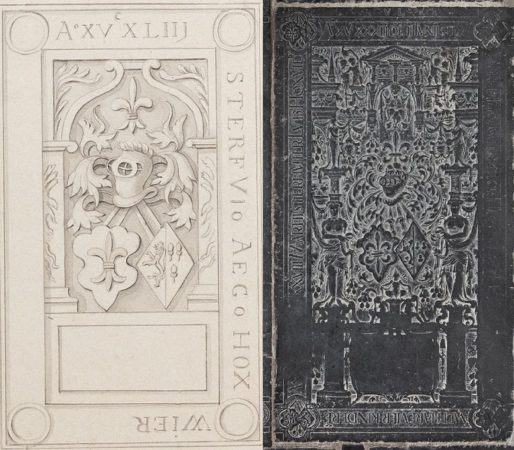 Zerk 322 Een grote en zeer fraaie zerk waarvan het randschrift aan de rechterkant en de tekst op de cartouche zijn afgesleten. Bovenin de rand staan de letters V. L. Dit zijn de initialen van Vincent Lucas de meester beeldhouwer. De tekst van het randschrift is: Ao XVC XXXIII de’ II Ivnij sterf Aike Herema … Zerk 322