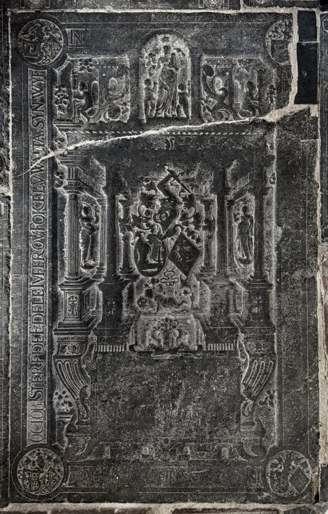 Zerk 325 Een grote zerk voorzien van zeer fraai beeldhouwwerk vervaardigd door Jelle Claesen. Een deel van het randschrift is afgesleten. In het beeldhouwwerk staan onder twee figuren de woorden: l. fedes en r. spes. Naam boven in rand is: Jelle Claese 1617 Tekst randschrift is: In ……………………………………….. october Sterf de Eedele Ivffrov Fokel van … Zerk 325