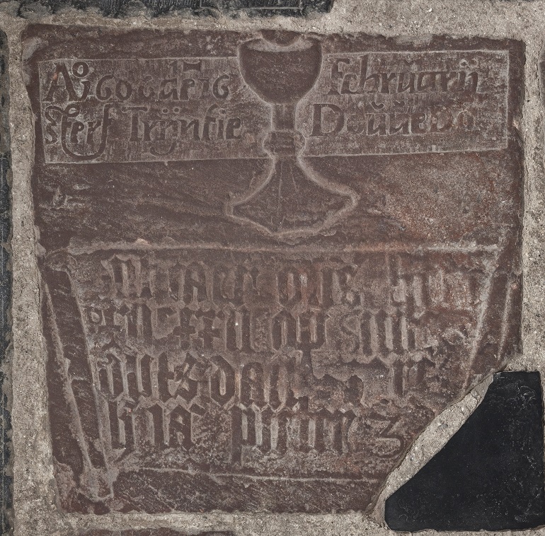 Zerk 327 Deze kleine rode Bremerzerk mist mogelijk het onderste deel, maar zeker is dat niet. Tekst bovenste deel is: Ao 1606 de’ 16 Februarii sterf Trijntie Dovve Dr. Tekst middenvlak is: int iaer ons Heer cXV XXII op Sinte ôlits dach starf ijsbrant Pietersz Het jaartal is 1522. De tekst boven wordt doorsneden door … Zerk 327