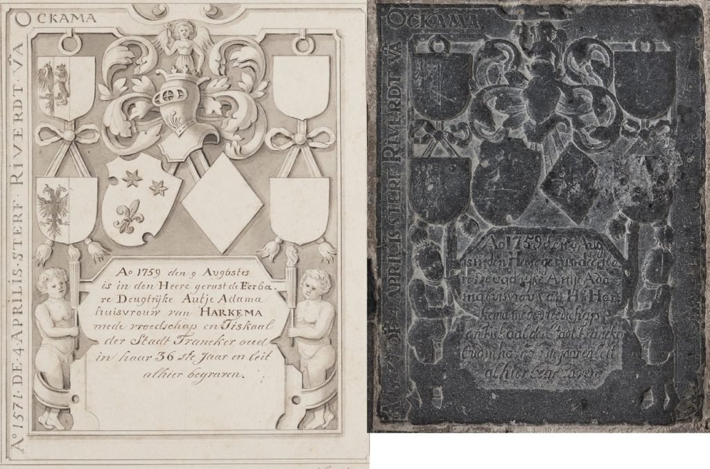 Zerk 329 Op het kleine maar complete zerkje naast de vorige is maar aan één kant een randschrift aangebracht. De tekst onder het beeldhouwwerk is bijna 200 jaar later aangebracht. Het randschrift is: Ao 1571 den 4 aprilis sterf Riuerdt va’ Ockama Tekst onder het Beeldhouwwerk is: Ao 1759 den 9 aug is in den … Zerk 329