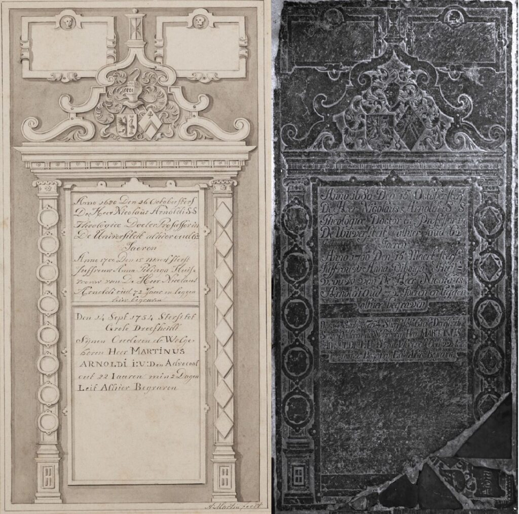 Zerk 331 De zerk is een grote met een fraai en afwijkend beeldhouwwerk. Tekst op het middenvlak is: Anno 1680 Den 15 October sterf De Heer Nicolaus Arnoldi S.S. Theologiae Doctor en Professor in De Universiteit alhier oud 62 Jaeren Anno 1700 Den 15 Maert sterf Juffrouw Anna Pibinga Huis vrouw van Den Heer Nicolaus … Zerk 331