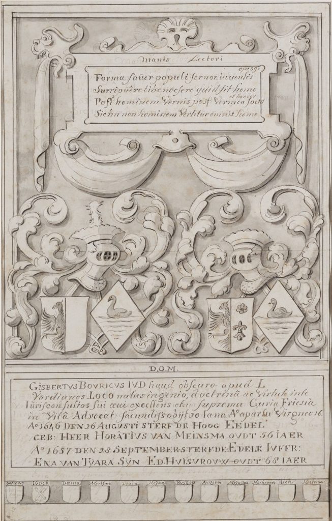 Genoemd Gijsbert Jacobs van Bouricius, geboren rond 1575, overleden op 30-01-1618. Zoon van Jacobus (Jacob) Hansz (de oude) Bouricius en Jets Gysberts Ysera. Ligt begraven in Beers. op 5 januari 1610 te Leeuwarden gehuwd met Ena Tjaerts (Eene Tjeerds) Tiara, overleden op 28-09-1657, Dochter van Tjeerd Johannes van Tiara en Ietje Jans Buigers. Ene Tjeerds … Zerk 333