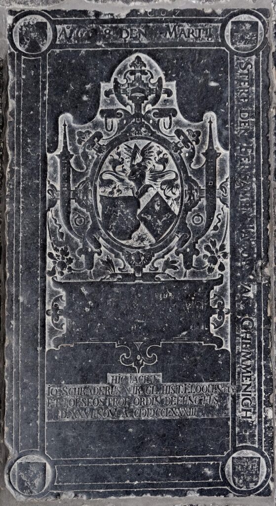 Zerk 34 Van deze zerk is het randschrift: Ao 1668 den I Marty Sterf Den Eersamen Jacob van Ghemmenich Onder het grote fraaie beeldhouwwerk staat: HIC IACET IO SCHRADERUS VIR. CL. HIST. ELOQUENTIA ET POESEOS PROF. ORDIN. DEFUNCTUS D. XXVI NOV A. CICICCCLXXXIII Jacobus van Ghemmenich was een zoon van Paulus van Ghemmenich en Eets … Zerk 34