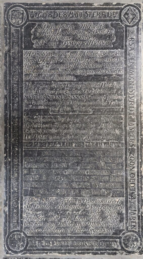 Zerk 45 Op deze zerk is de tekst goed leesbaar. Het randschrift is: Ao 1608 de’ 8 Maij sterf de’ Eersamen Man Sivrdt Jaspers zoon olt 46 Iaren Anno 1644 de 3en Iuni Sterf de Eerbare Antie Harms Dor. huisfrou Va’ Ieldert Wijbes oudt 27 Iaer En leit Hier Begraven Met Haer Zoon Sufides Postma … Zerk 45