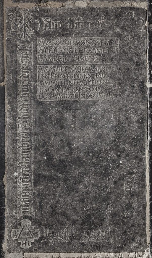 Zerk 51 Deze zerk ligt iets naar boven en heeft een randschrift in gotische letters. De tekst is voor een deel leesbaar. De rechterkant is geheel afgesleten. De tekst op het middenvlak is wel geheel leesbaar. Het randschrift is: Anno Domini M Vc …………… starf d` Eebaren man Pieter Lamberts: bid voer die ziel Tekst … Zerk 51