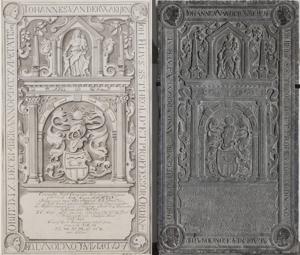 Zerk 68 Tekst randschrift is: Johannes van der Waeijen Joh. filius S. S. Theol. Dr. et Professor ordin. Academiae Con Sionator Obiit Den IX Decembris Anno MDCCXVI Aetatis XL Tekst onder beeldhouwwerk is: Cornelia Veth conjux Joh. van der Waeijen Obiit D’ 26 Aug. Anno 1696 Aet. 51 Johannes van der Waeijen S. S. Theol. … Zerk 68
