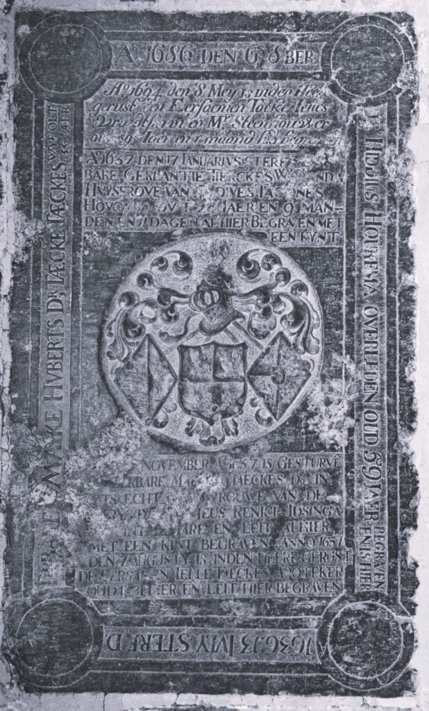 Zerk 71 De tekst van deze zerk luidt: Ao 1686 den 6 8ber is Hiddius Houkema overleden oud 59 Jaer en is hier begraven Ao 1636 22 Iuly sterf d’ Eerbare Maike Hvberts Dr Taecke Taeckes wyf olt 35 jaar Tekst boven wapenschilden is: Ao 1694 den 8 Meij is in den Heere gerust den … Zerk 71