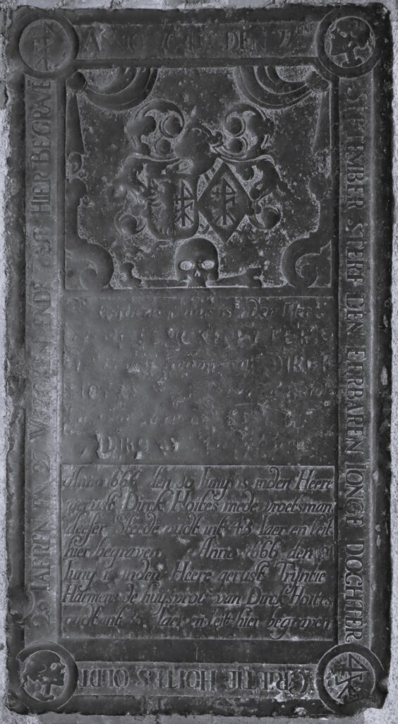 Zerk 81 het randschrift: Anno 1649 den 11en september sterf den Eerbaren jonge Dochter Grietie Hoites oldt 25 Iaeren en 27 weecken en de leit hier begraven tekst middenvlak is: Ao 1651 den 4 Mai is in den Heere gerust Sioucke Pytters docht. de huysvrouw van Dirck Hoites ………………. ende leit hier ……….. Hoite Dircks … Zerk 81
