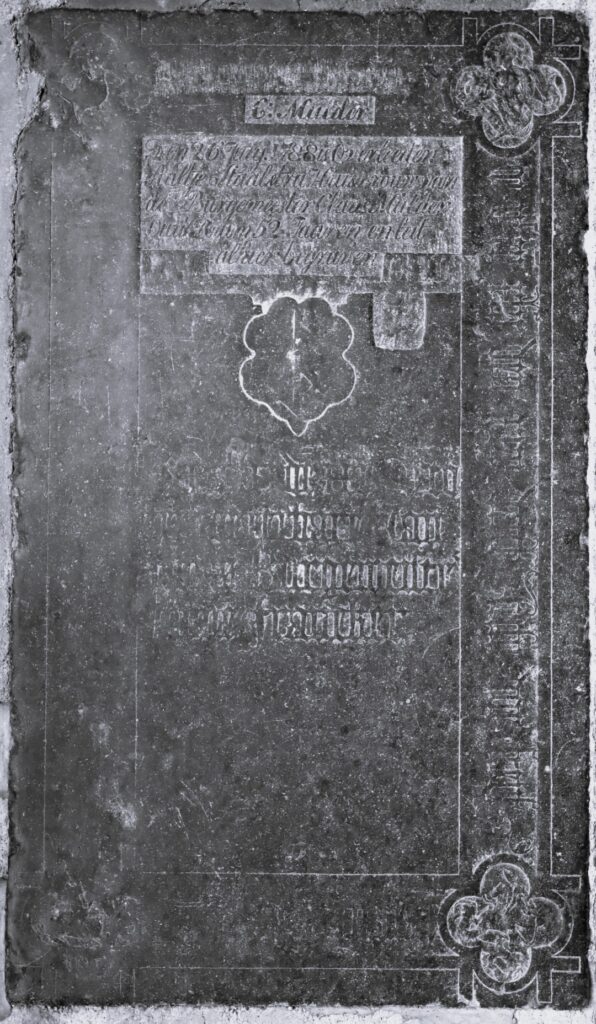 Zerk 84 Deze zerk is nogal beschadigd wat het ontcijferen van het oude gotische randschrift en de tekst onder het huismerk erg lastig maakte. Het randschrift betreft een persoon van de familie Ens tekst deel randschrift is: … M Vc en XLII den XXII dach Febr doe sterf ………… Tekst op middenvlak is: C: Mulder … Zerk 84