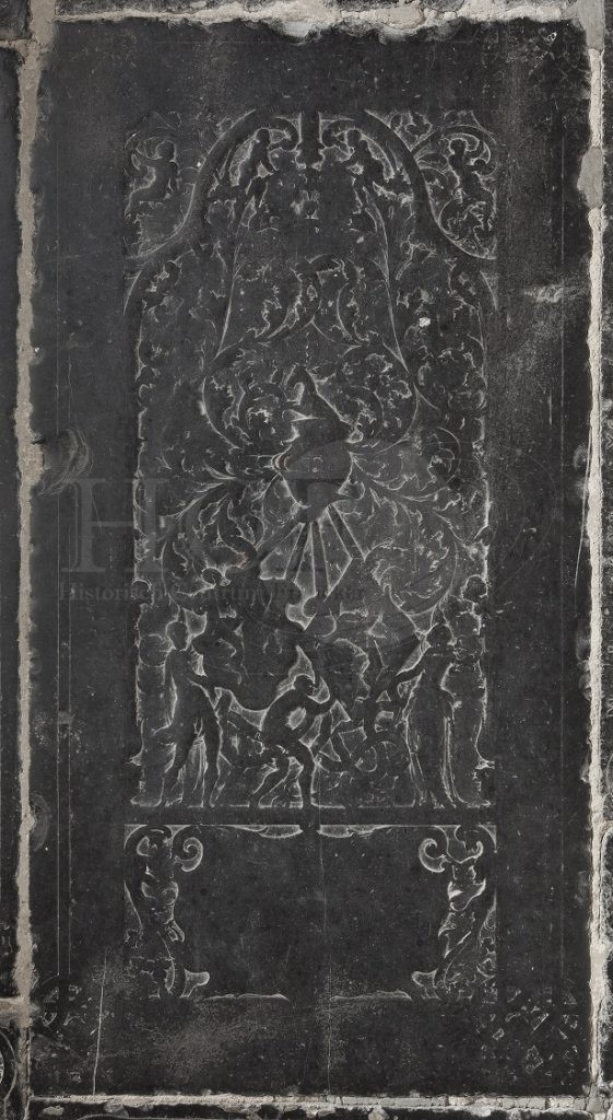 Zerk 93 De tekst van deze grote zerk is volkomen afgesleten. Ook het fraaie beeldhouwwerk dat bijna de gehele zerk vult is afgesleten, maar nog wel duidelijk herkenbaar. Het beeldhouwwerk lijkt erg veel op dat van zerk nr. 36. Naast veel ornamenten is er ook een soort boog te zien waar zowel buiten als binnen … Zerk 93