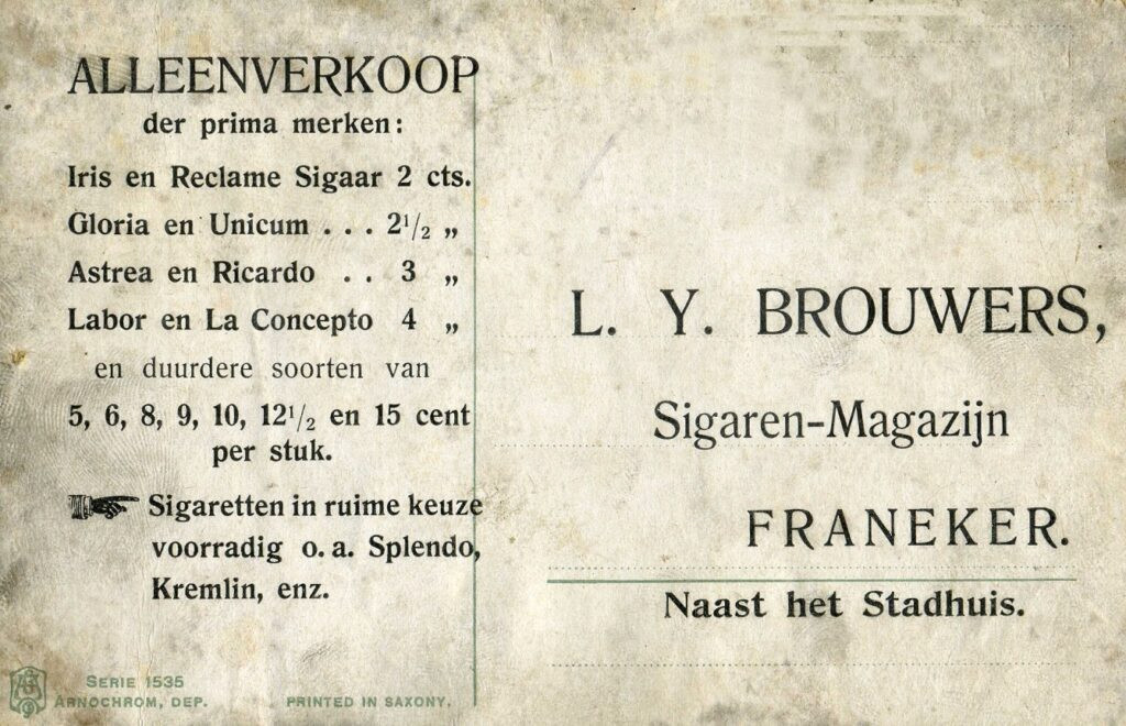 Reklame kaart voor sigarenmagazijn L.Y Brouwers ( Lammert Ysbrands ) Hij woonde zelf ernaast op nummer 7.