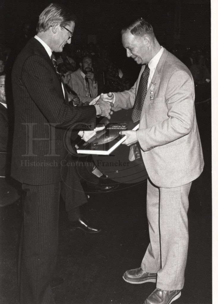 Burgemeester Jaap Pop, ( Alphen aan den Rijn, 23 juni 1941 – Haarlem, 6 januari 2026) ( Burgemeester Franeker 1975- 1981) met verschilende mannen die elkaar de handens schuden.