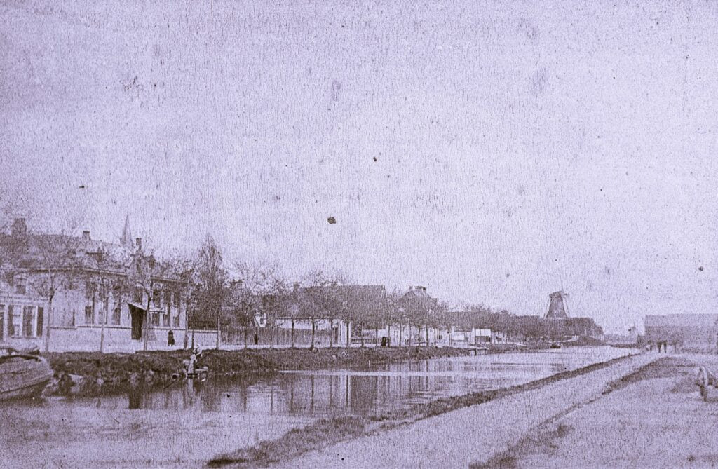 Vrij zicht op de Zuiderkade vanaf de overkant van het Van Harinxma kanaal. De huizen op de Tuinen zijn nog niet gebouwd