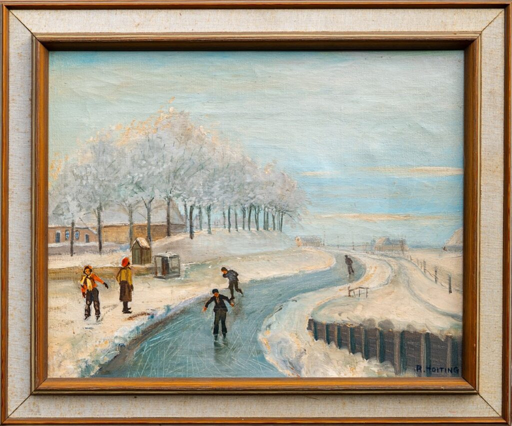 Winter. Schaatsen. Schilderij van Reintje Hoiting van schaatsers langs het Noorderbolwerk ter hoogte van het Leeuwarderend.