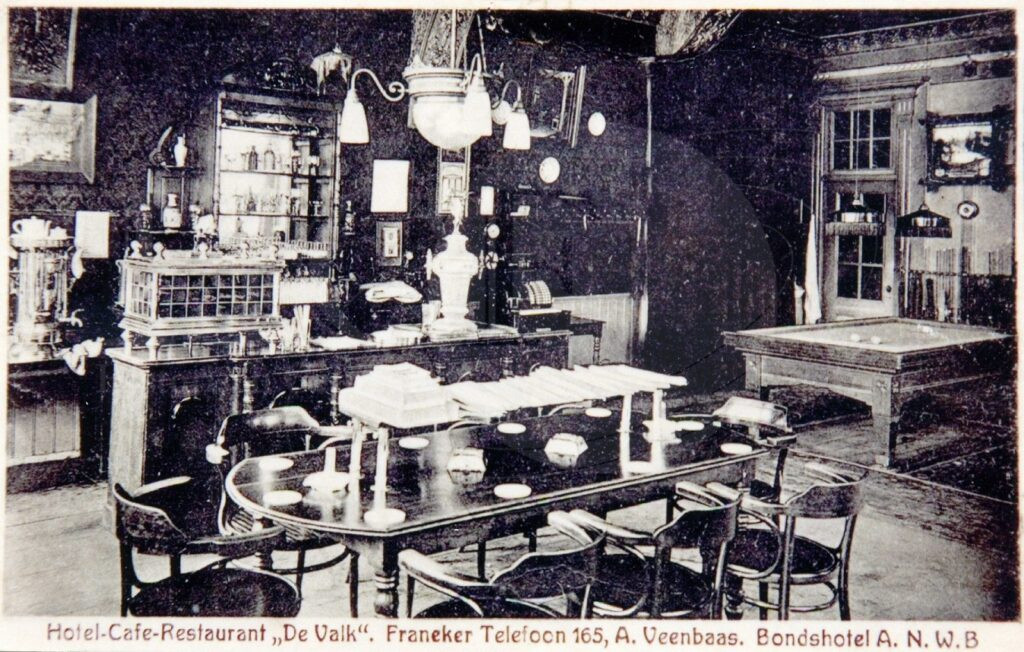 Voorstraat 2. Hotel de Valk in de Camminghastins met serre er voor. Zit in deze tijd Zoodsma in. De eigenaar hiervoor was Veenbaas. Wagens werden op het plein achter de Valk geparkeerd en ook de paarden hier verzorgd. In de serre was het prettig zitten met een nadeel regelmatig reed er een voertuig tegenaan Voor was het trottoir maar 3 tegels breed, dit in tegenstelling tot de andere kant waar het zeer ruim was.