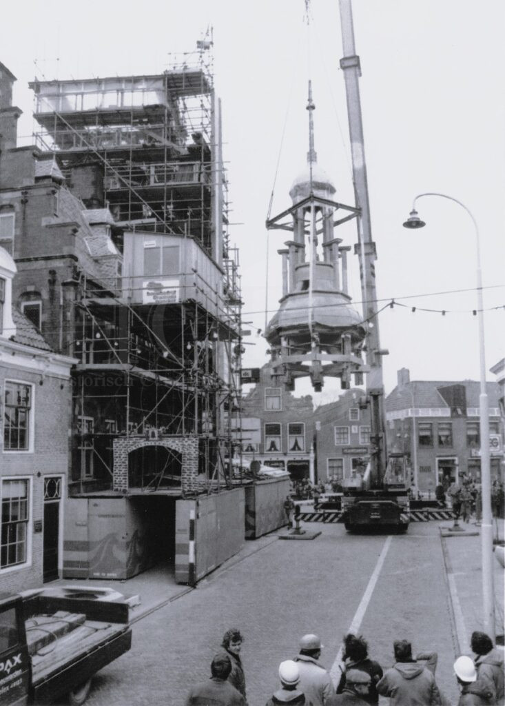 De restauratie van het Raadhuis. Uitgevoerd door Firma Draaisma uit Franeker. Hier word de toren van het carillon eraf getild