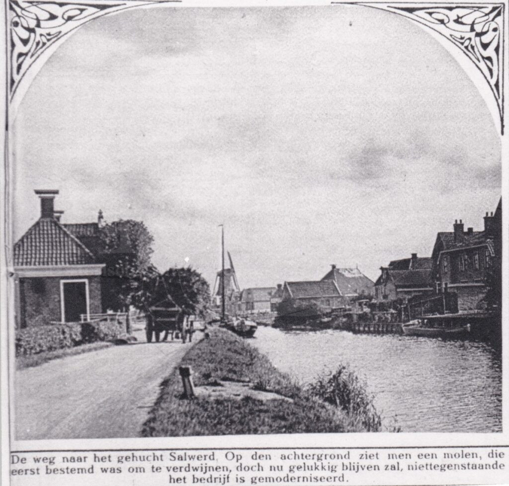 Salverderweg met op nummer 19 de boerderij van Hettinga, een skûtsje vaart richting Leeuwarden.