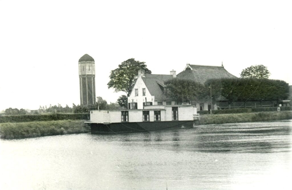 De Boerderij van Hettinga. Aan de wal ligt een woonboot. De watertoren op de achtergrond