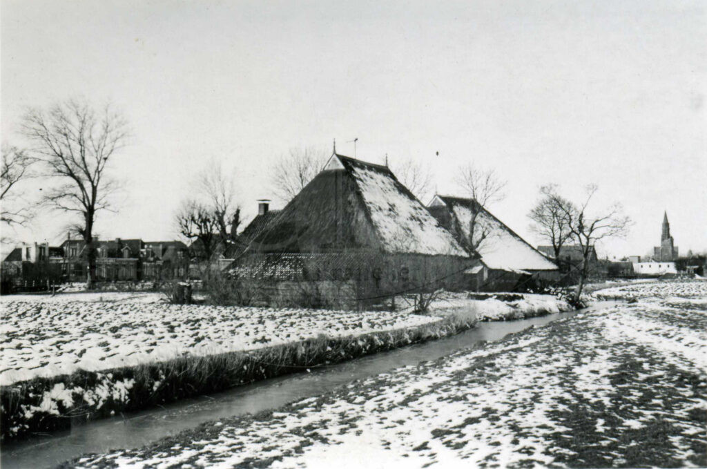 Salverderweg met op nummer 19 de boerderij van Hettinga. Een schip vaart door het ijs richting Leeuwarden.