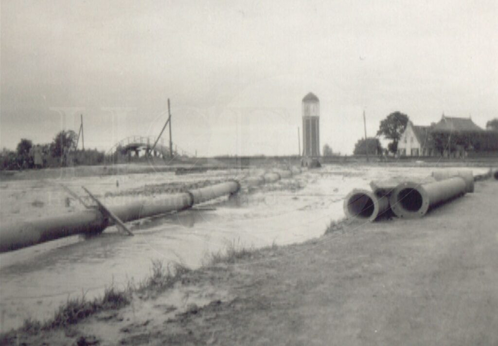 Dempen d.m.v opspuiten van het stuk kanaal tussen Salverdervaart en Stationsbrug. Rechts De Boerderij van Hettinga. Links de Paardenbrug en in het midden de Watertoren.