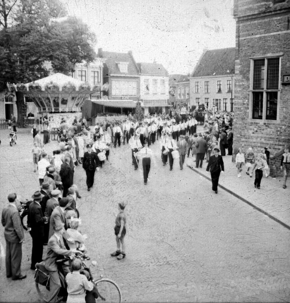 Optocht met drumband en Zweefmolen op de Breedeplaats. Rinse Uithof loopt voorop. Het gaat waarschijlijk om de PC van eind jaren 50. In de drumband lopen mee Teake Zijkstra, Tietie Zijlstra en Riemie Zijlstra. Bij de trommelaars waren o.a. Siepie van Emmen, Nollie van Wier, Arjen Miedema, Jan Seerden en Jelle Pekel.