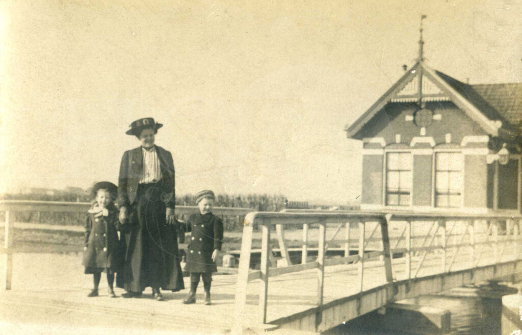 Een vrouw met twee kinderen bij de draaibrug aan het eind van het vliet.